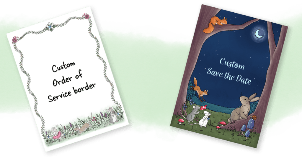 I really loved bringing both of these designs to life, below is a close up of the ratty border for the Order of Service including the ratty in a tutu! I love these personal little details.