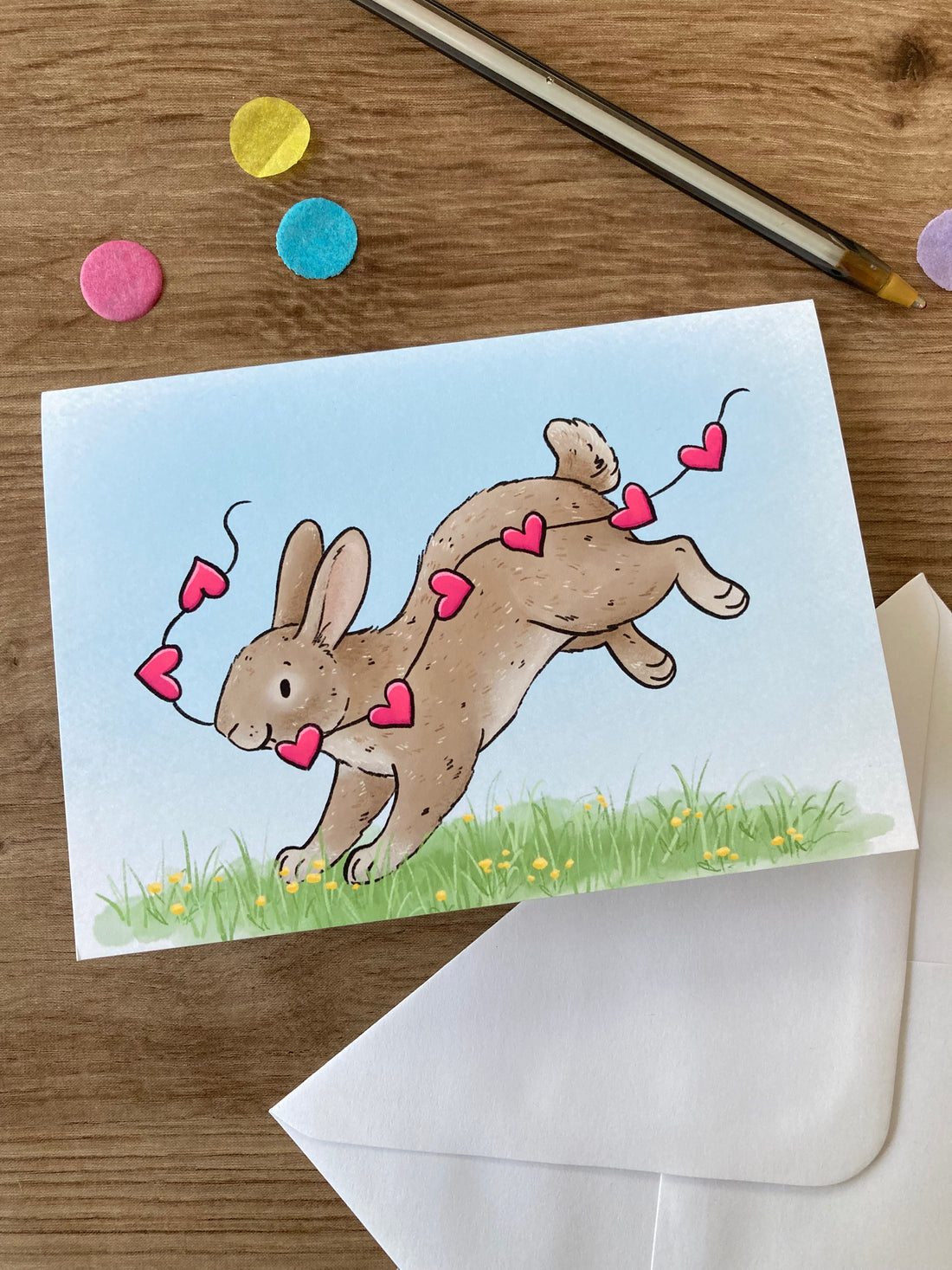 I also really love rabbits as they’re just so cute and so much fun to watch when they’re busy doing bunny things. This is one of my favourite bunny designs that I’ve done, and would make a fantastic Valentine’s Day card (or even an anniversary card) for the bunny lover in your life.