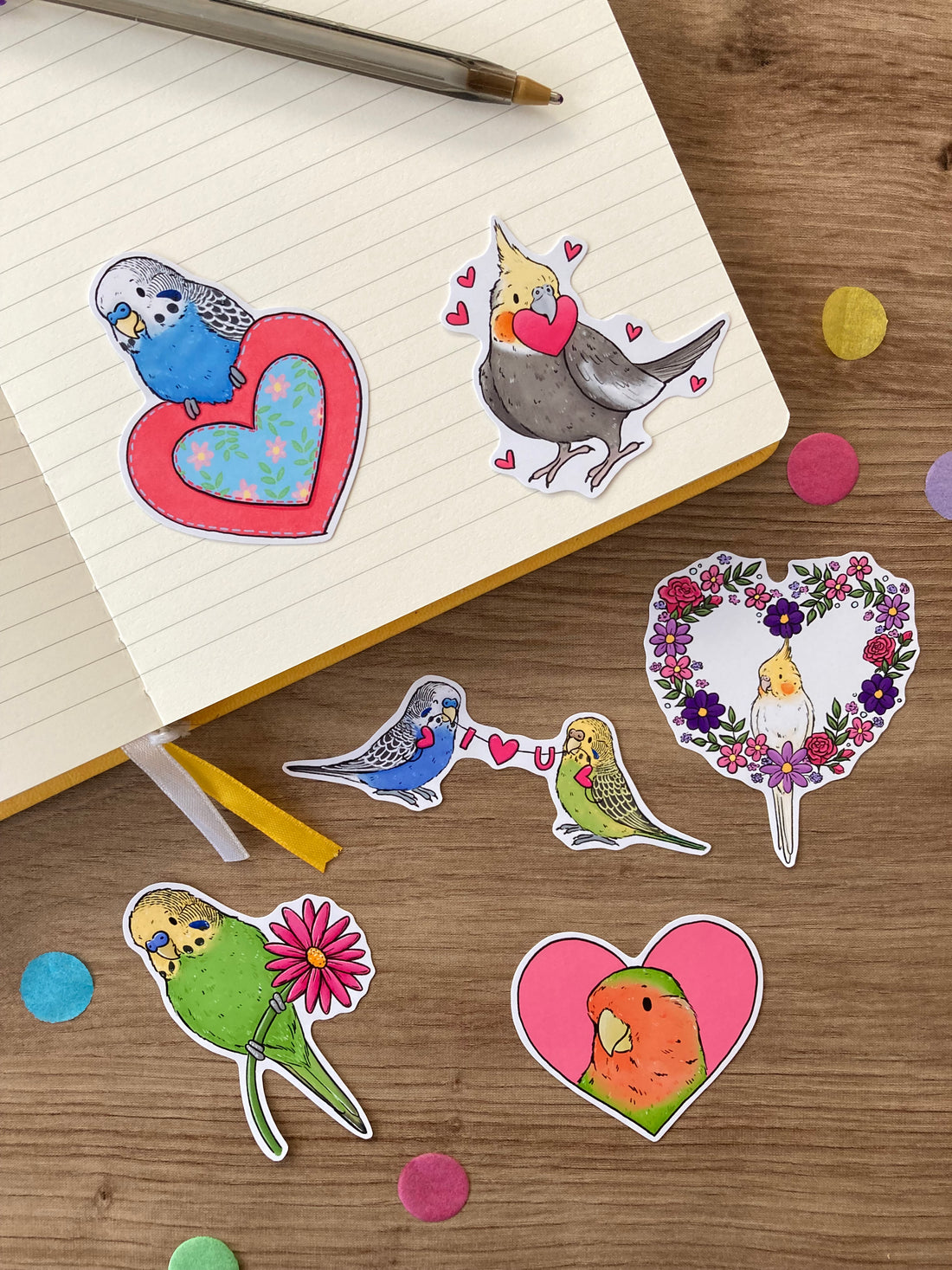 For something different, I also do stickers, and these are just fun to put around. Featuring a few of my other designs that I’ll be talking about in the next couple of sections, these stickers feature a variety of birds in various love situations or styles, and would make a perfect way of showing someone who loves birds that you love them.
